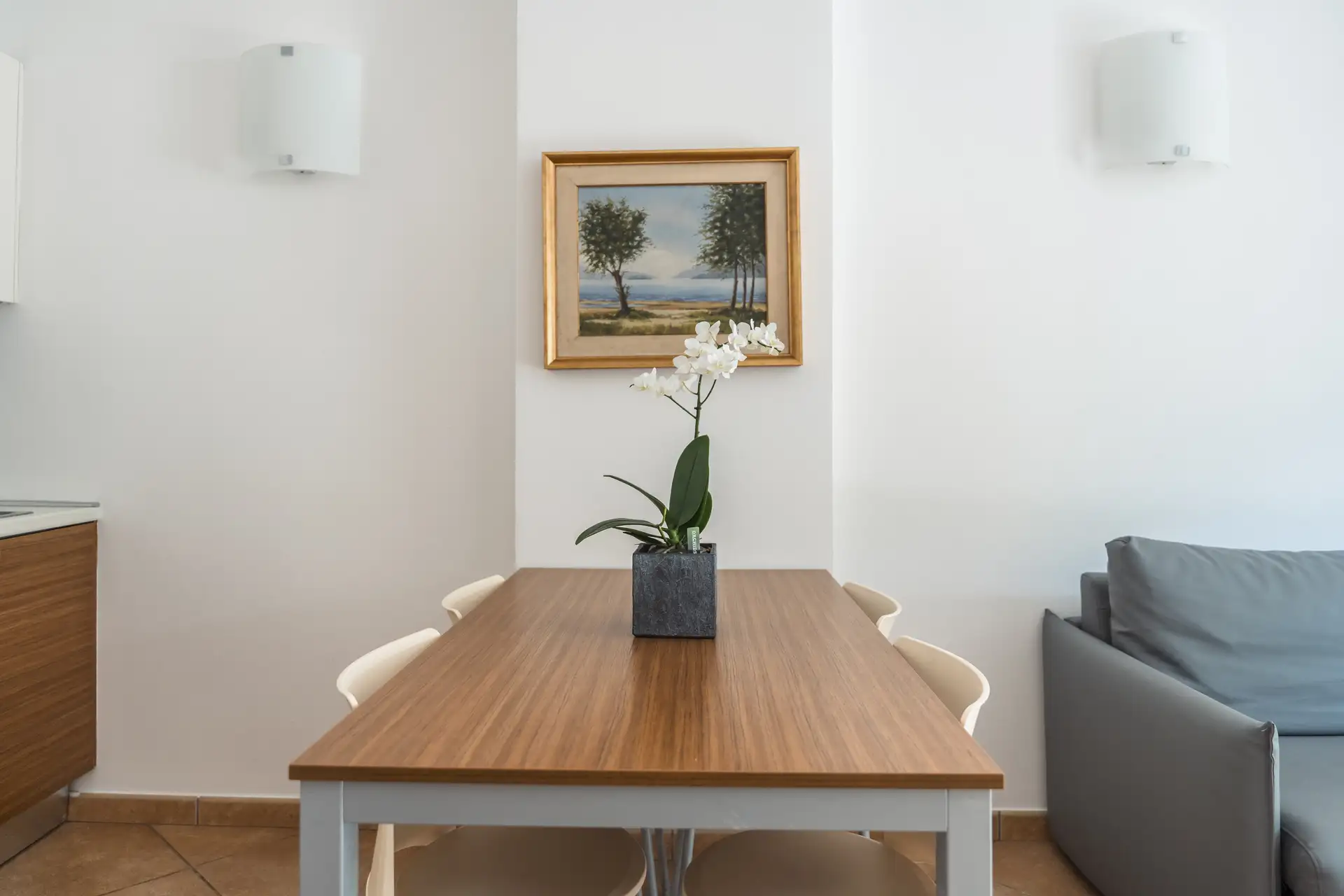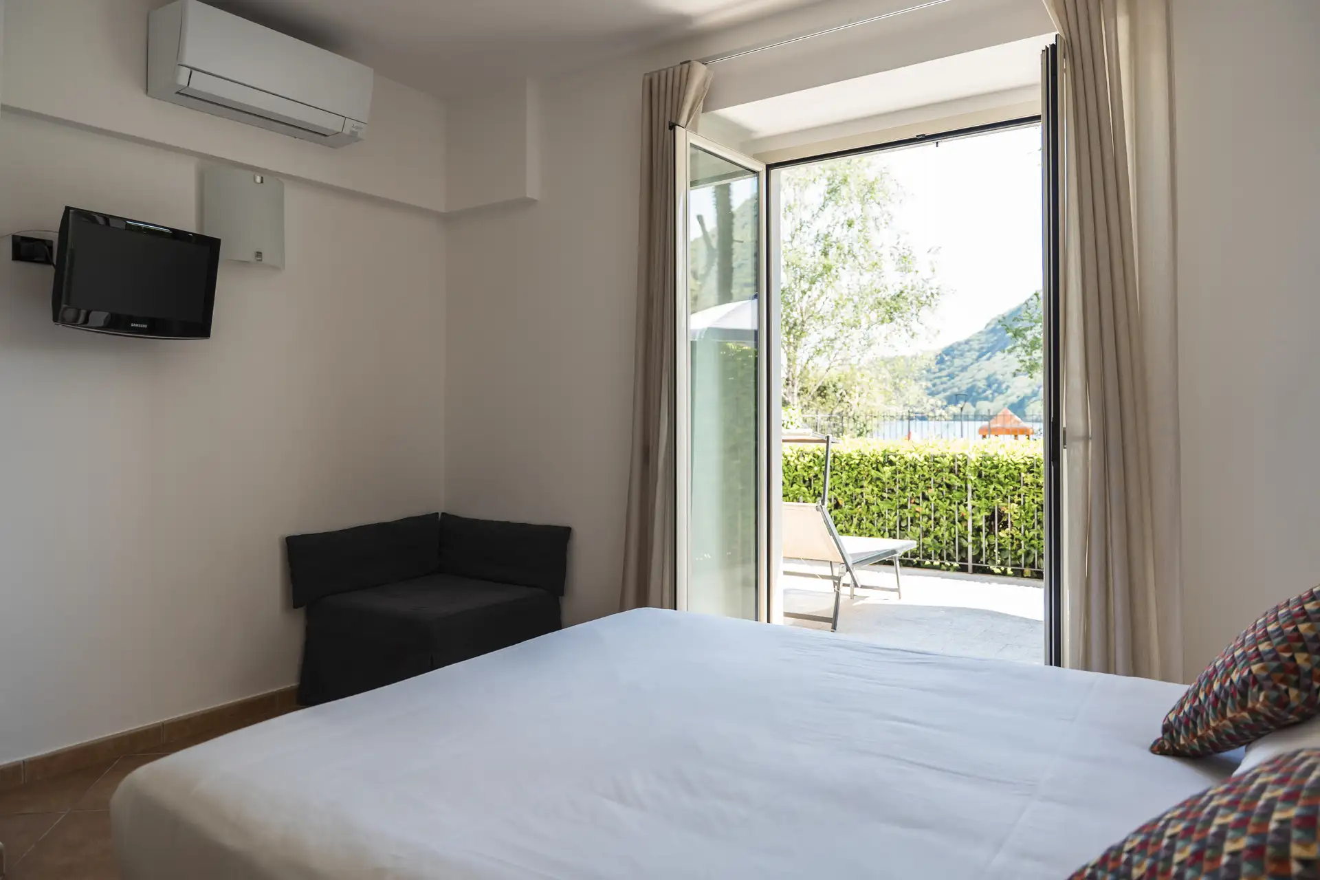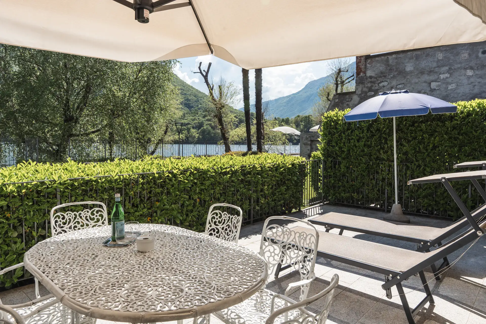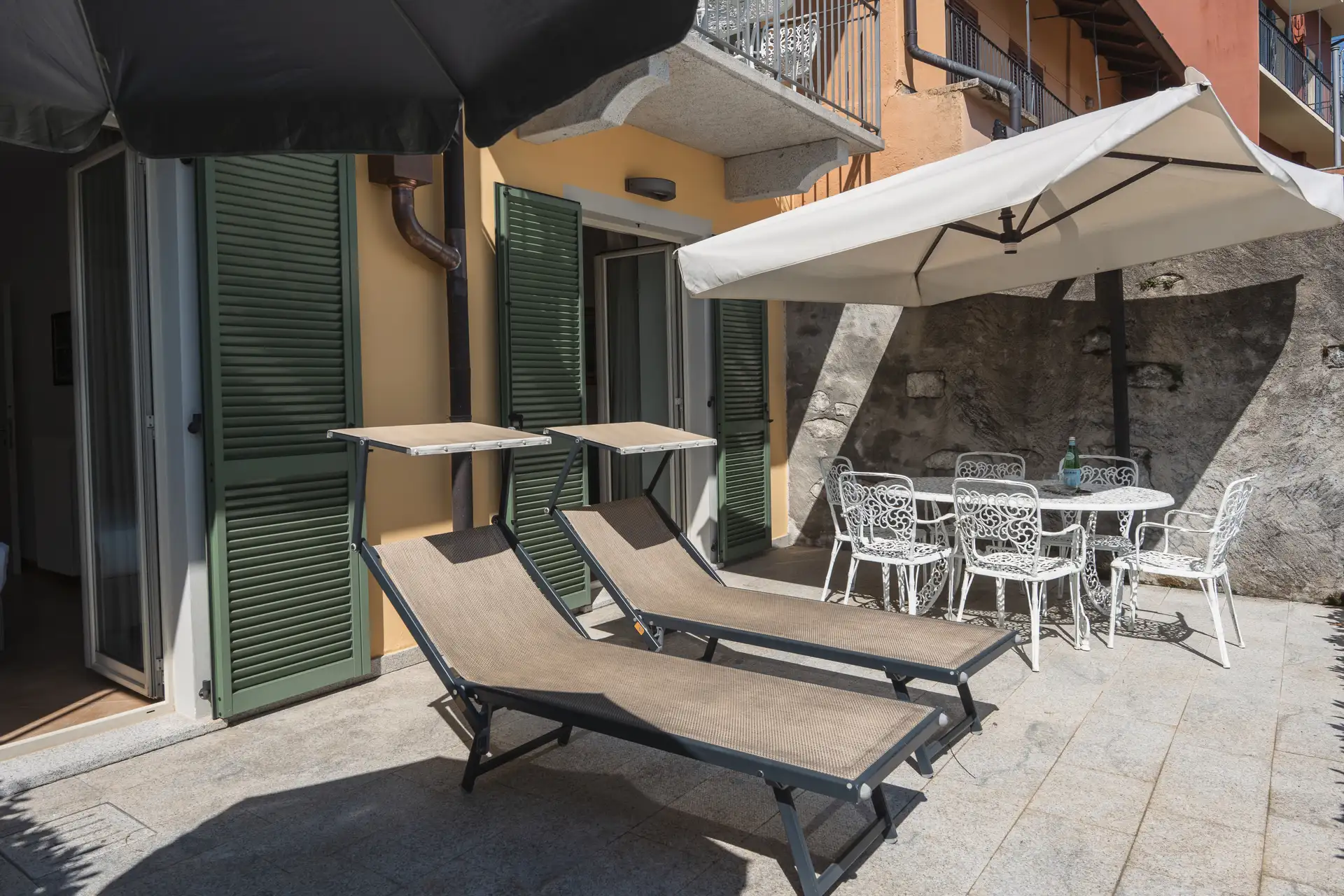 Situato a pian terreno del Residence, questo appartamento di circa 60 m2 è composto da un’accogliente entrata, una camera matrimoniale, un salotto con divano King Size e televisore a schermo piatto, angolo cottura, una sala da bagno con doccia ed un ampio terrazzo privato fronte lago attrezzato con sdraio, ombrellone e tavolo da pranzo. Questo bilocale ospita comodamente fino a cinque persone.
